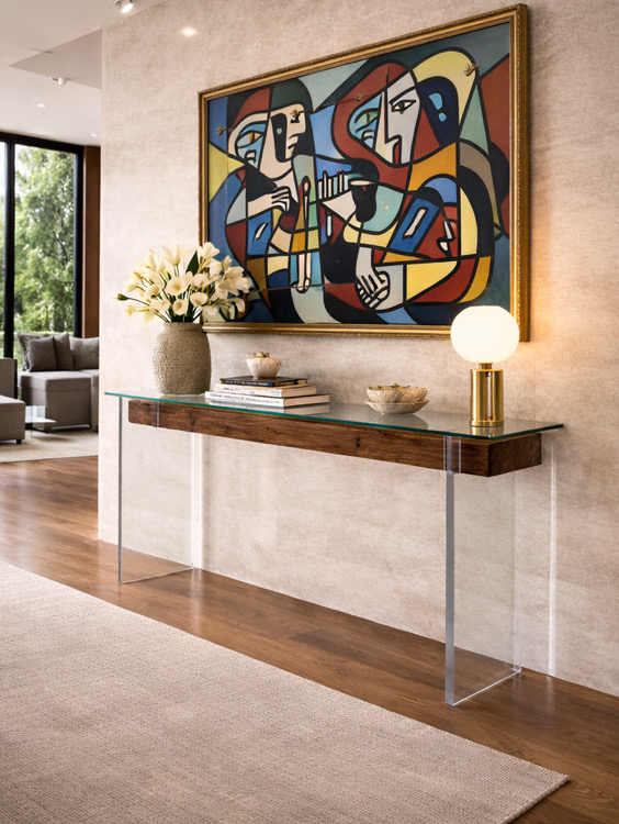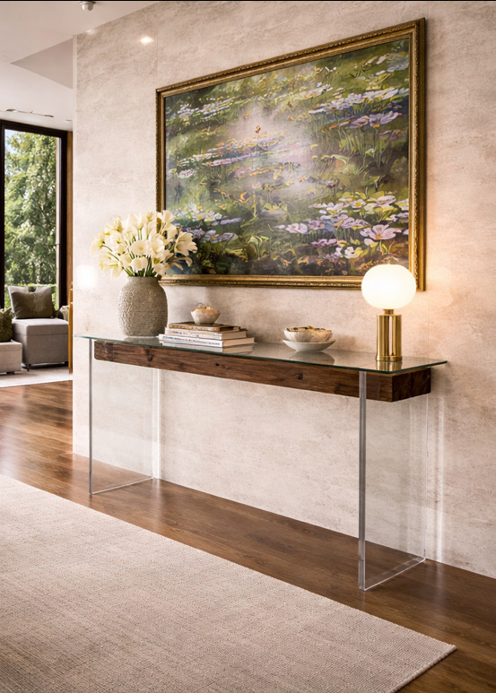 The Fiorelita Sofa Table is a refined blend of modern transparency and natural warmth. Designed to complement contemporary living spaces, this piece combines clear acrylic legs with a distressed wood element and a tempered glass top, creating a balanced and elegant silhouette.